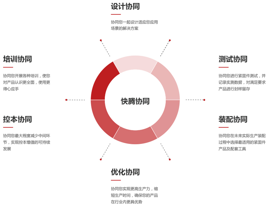 所謂協(xié)同,就是指協(xié)調(diào)兩個或者兩個以上的不同資源或者個體,協(xié)同一致地完成某一目標的過程或能力。 快騰協(xié)同旨在為您的選購提供更廣域的深度支持,從設(shè)計、測試、裝配、優(yōu)化、控本及培訓(xùn)六個方面配合協(xié)同,追求最合理有效的完美緊固方案。